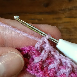 Toer 3 (verkeerde kant): 5 vasten, onzichtbare mindering over de laatste vaste van toer 2 en de eerstvolgende vaste van de grote hiel, 1 vaste, keerlosse en keer je werk om. Je hebt nu 7 vasten gehaakt.